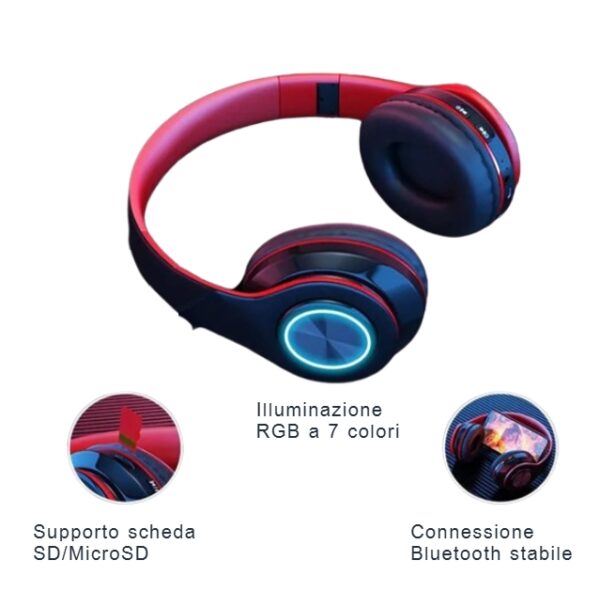 Cuffie Bluetooth Wireless con Luci RGB – Color nero esterno e rosso interno- Immergiti nella tua musica o nei tuoi giochi preferiti con stile e comfort!