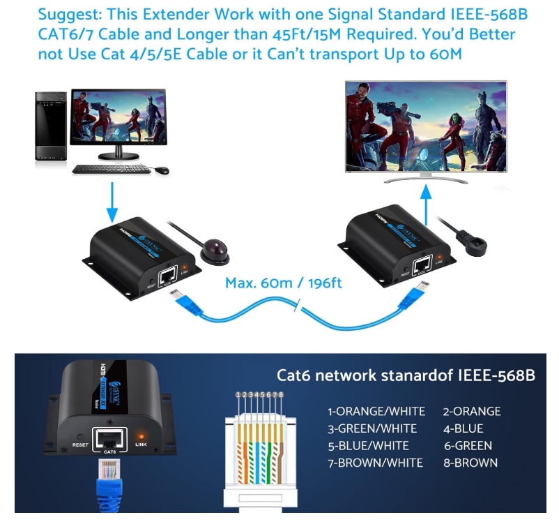- Supporta 1080p HDMI & Mantenere la qualità del segnale su lunghe distanze invece di utilizzare costosi cavi HDMI. Questo dispositivo consente di utilizzare il cavi CAT6 esistenti, prese di corrente, mentre anche con le stesse funzioni come Trasferimento di profonda Video a colori e New Lossless audio compresso. Supporta risoluzioni video di 1080p / 1080i / 720p / 576p / 576i / 480p / 480i a 50/60 Hz