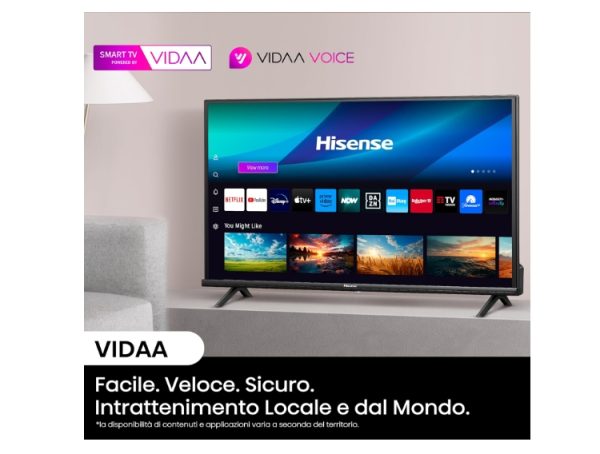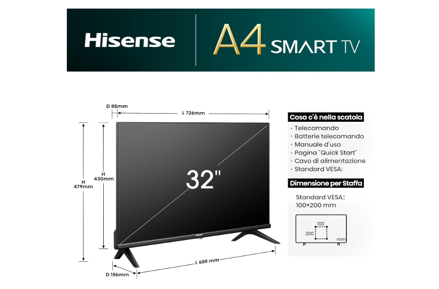 Hisense TV 32″ HD Ready 32A4N, Smart TV VIDAA U7, Game Mode, Works with Alexa, Tuner DVB-T2/S2 HEVC 10, lativù [Classe di efficienza energetica F]