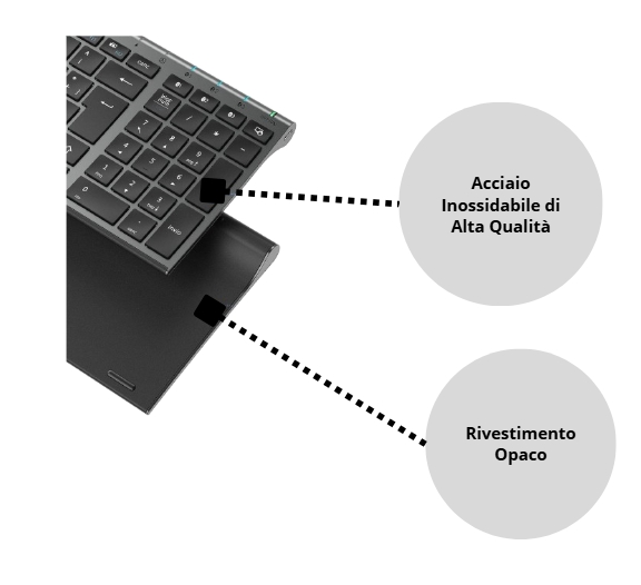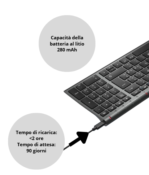 Dotata di batteria ricaricabile tramite USB-C, elimina la necessità di batterie usa e getta, offrendo una soluzione più sostenibile. La funzione di risparmio energetico ottimizza i consumi mettendo automaticamente la tastiera in standby quando non in uso.