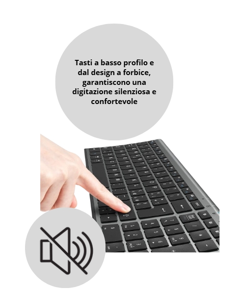 Tasti a forbice a basso profilo per una scrittura fluida, reattiva e silenziosa, ideale per ufficio e ambienti condivisi.