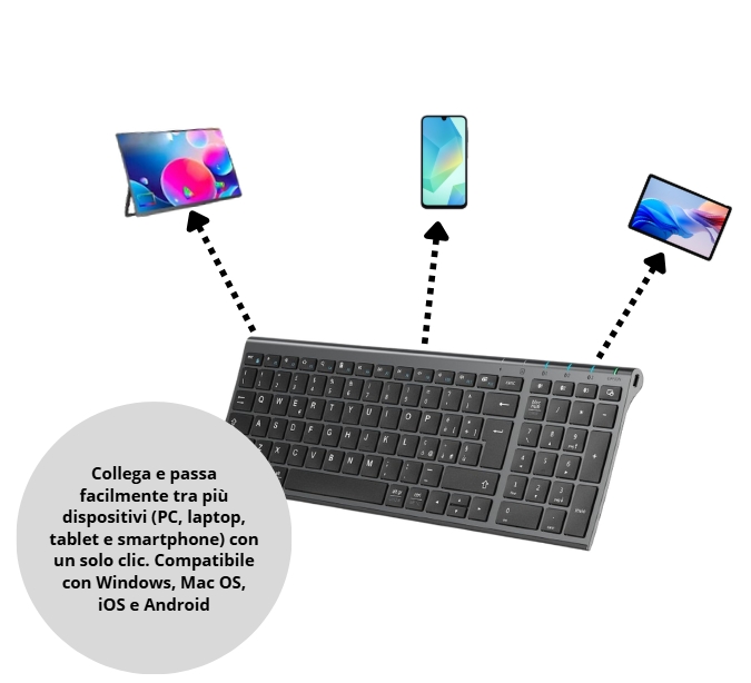 Scopri la comodità e l’efficienza di una tastiera progettata per semplificare il tuo lavoro quotidiano. Questa tastiera Bluetooth 5.1 multi-dispositivo in elegante grigio space combina tecnologia avanzata, design compatto e massimo comfort di utilizzo.